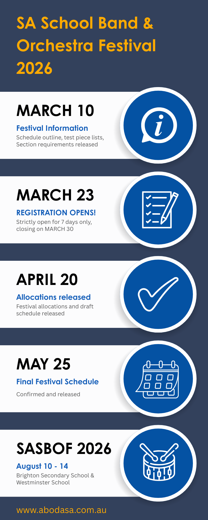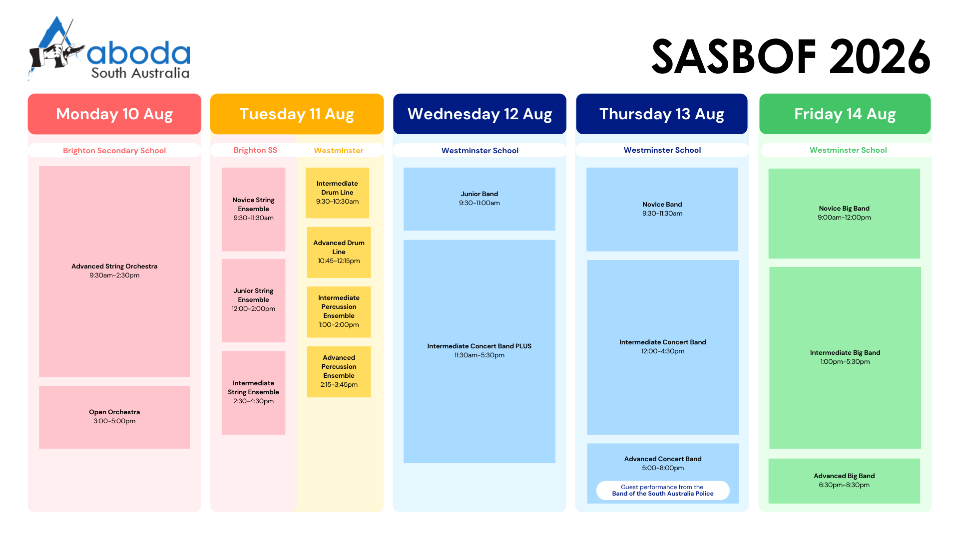ABODA SA is proud to once again present the SA School Band and Orchestra Festival, where over 3000 students from nearly 40 schools will perform at Westminster School and Brighton Secondary School over 5 days.